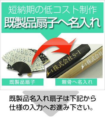 制作期間が短く且つお安い価格で作成が可能な既製品扇子の親骨にイベントや社名などを名入れする扇子。そして、扇面をお客様のお好きなデザインでプリントが可能なフルオーダーによってフォームが変わってきます。