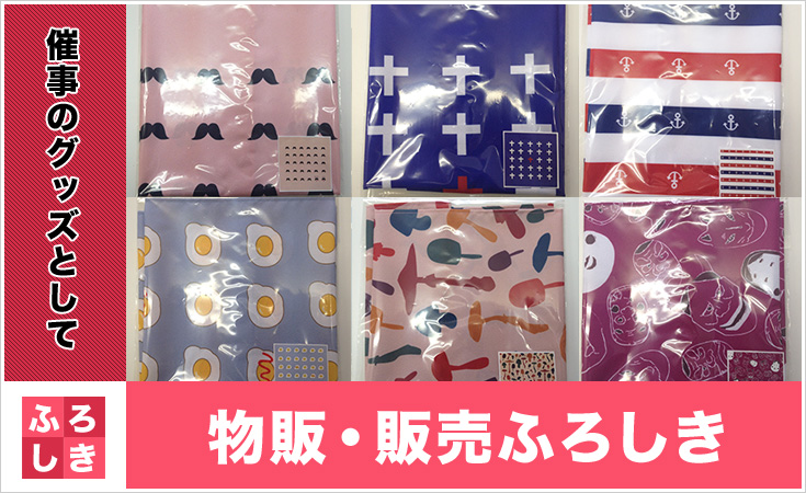 ライブ会場やイベントなどの物販としての販売アイテムとして使われる事もあるオーダーメイド風呂敷。作られたいデザインにより綿か化繊かの別注生地の最適なご提案をさせて頂きます。